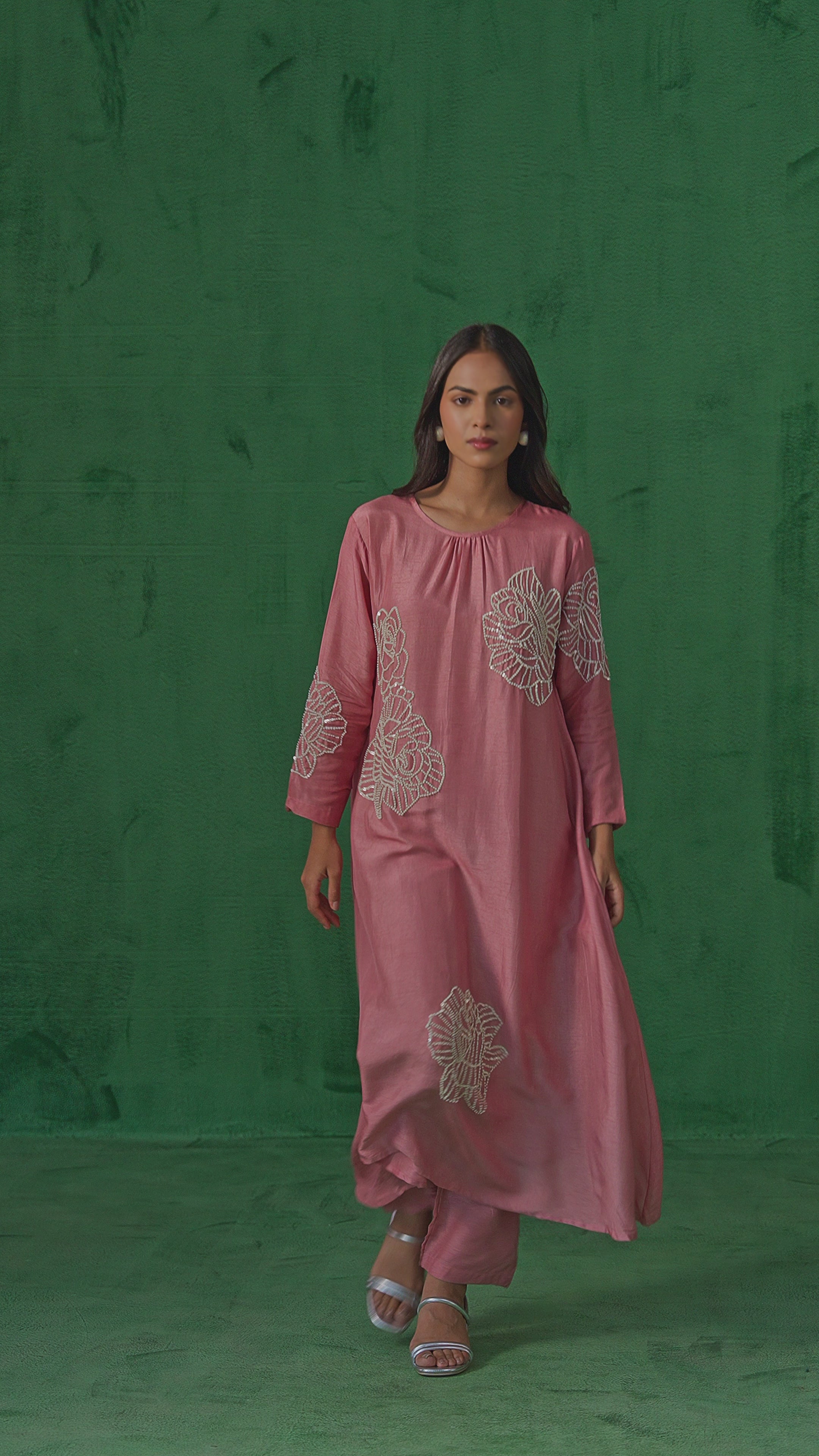 This elegant kurta pant set is crafted from luxurious raw silk in a soft dusty rose hue. The straight kurta features intricate bead and sequin work in floral motifs, adding a touch of shimmer and sophistication. Paired with matching raw silk pants, this ensemble is perfect for festive and formal occasions with a graceful, understated charm.