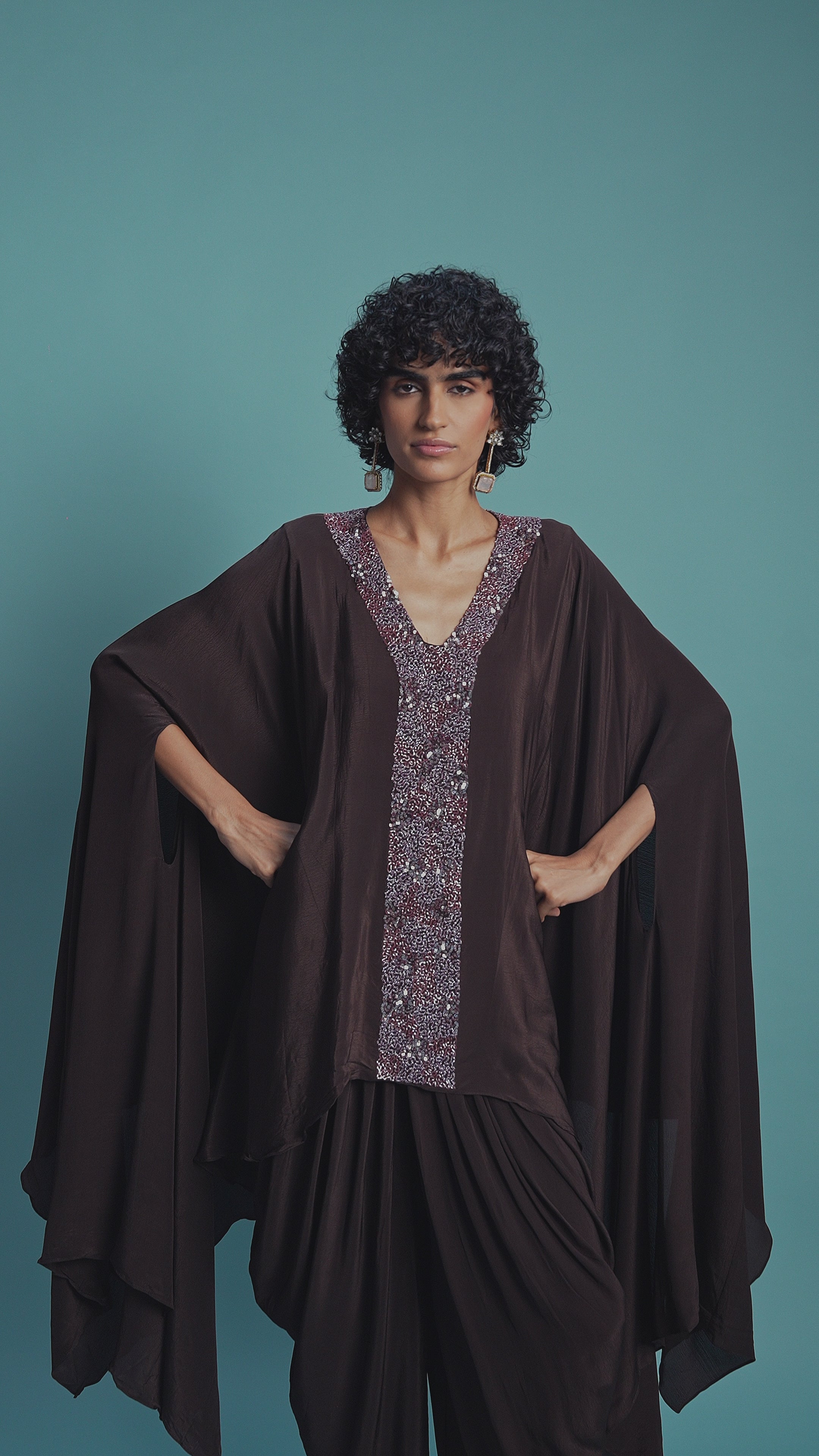 The fluid drape of the kaftan, with its dramatic flared sleeves and asymmetrical hemline, creates a modern and graceful silhouette. The kaftan is richly embellished around the V-neckline and center with sparkling sequins and intricate cut dana work, providing a beautiful contrast to the solid fabric. The matching dhoti pants add a touch of traditional flair, making the ensemble a perfect blend of contemporary style and classic comfort.