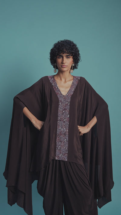 This elegant two-piece set features a high-low kaftan and dhoti pants, all in a beautiful coffee brown shade of satin silk.