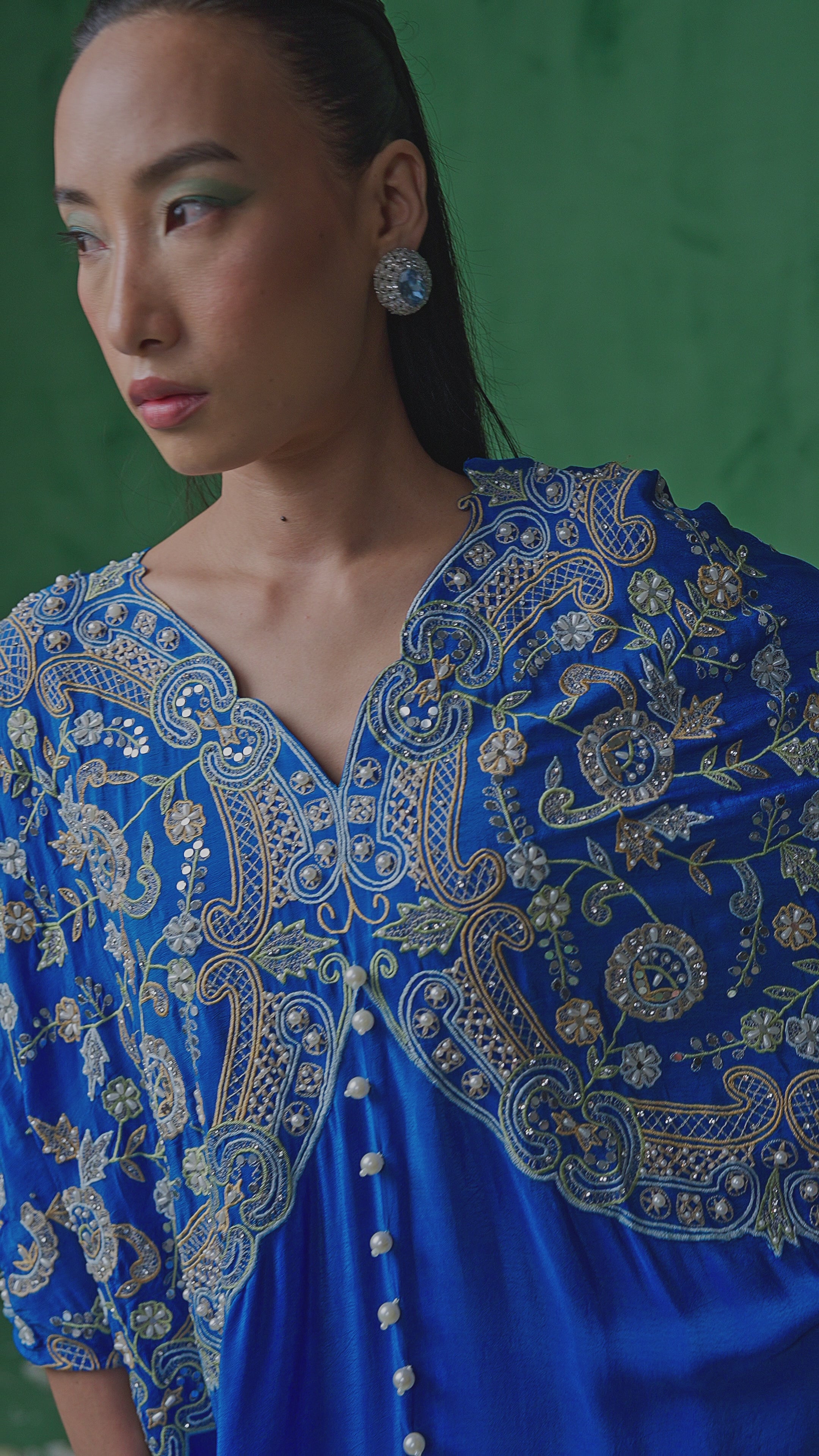 Electric Blue Embellished Chinon Silk Kaftan Set