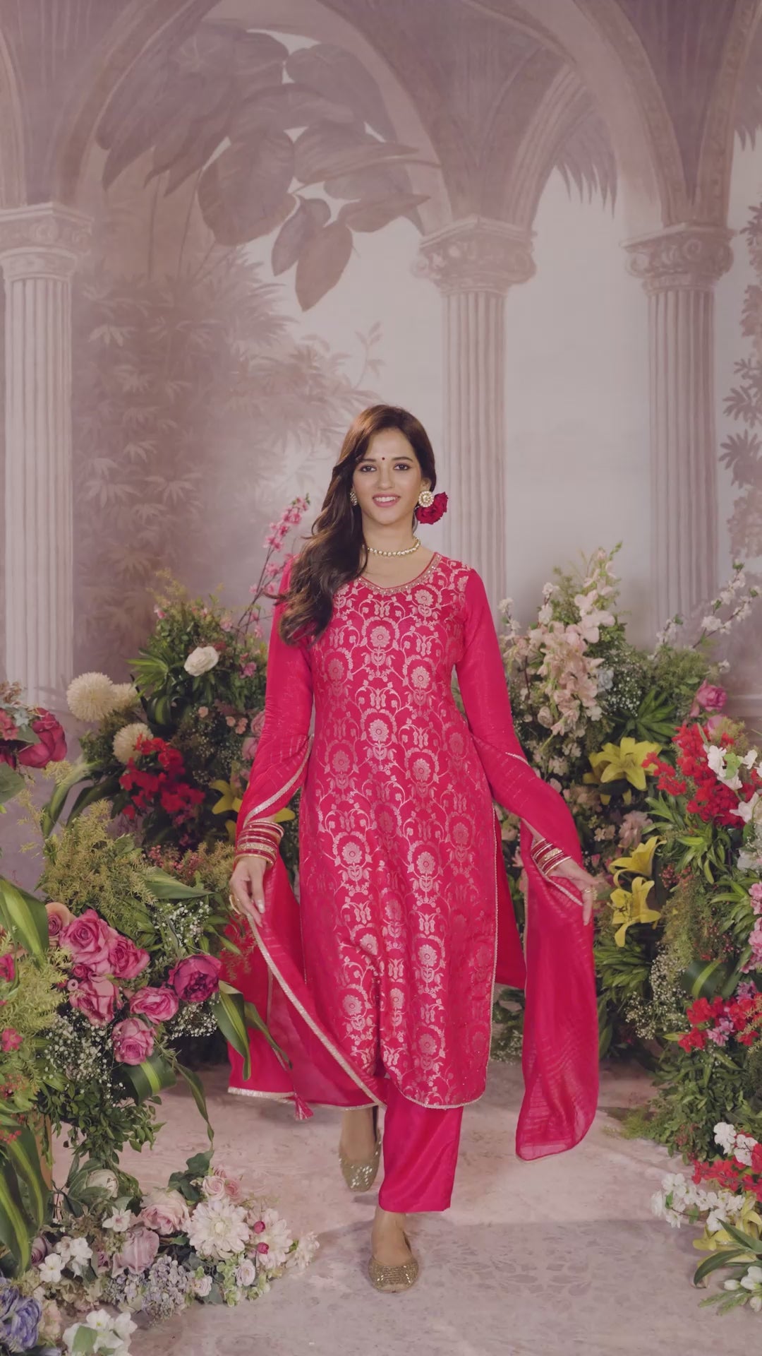 This captivating three-piece set combines the richness of traditional weaving with contemporary tailoring, perfect for festive occasions. It features a straight-cut kurta crafted from luxurious Brocade Silk with all-over golden motifs, a sleek pant in soft Upada Silk, and a flowy Soft Organza Silk dupatta.