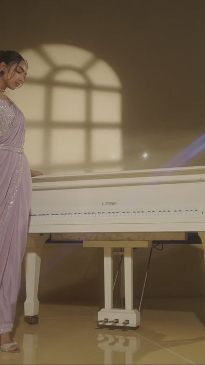 An elegant Lilac Chinon Silk Draped Saree set featuring a lustrous pre-draped saree skirt paired with a chic cropped blouse, both beautifully embellished with intricate sequin, bead, and cut dana handwork.