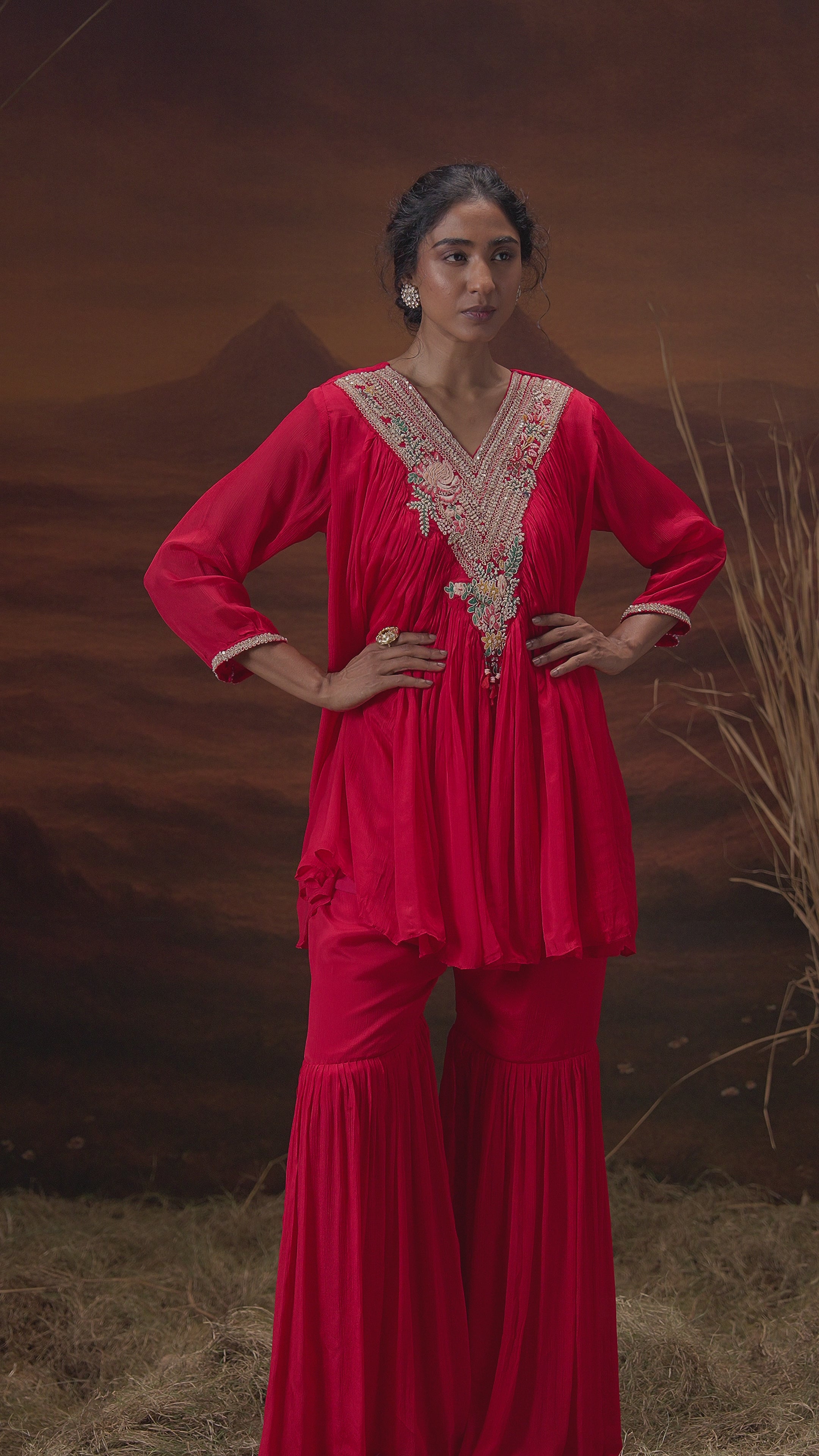 Radiate festive charm in this stunning Coral Red Sharara Set, exquisitely handcrafted with rich embroidery and luxurious embellishments — made to dazzle at every celebration.