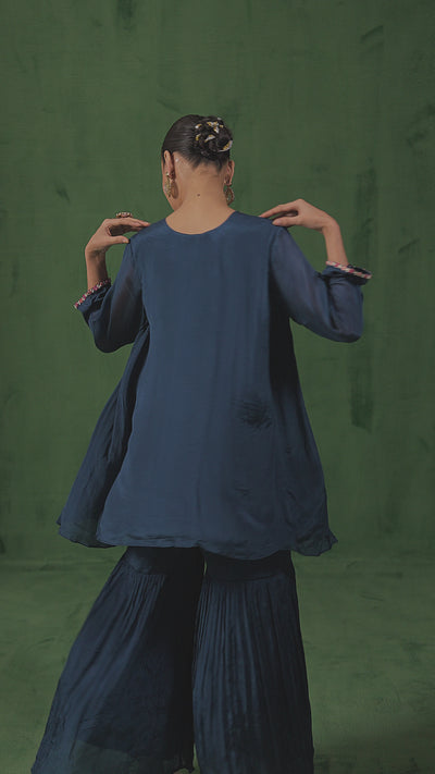 Elevate your festive look with this Majestic Midnight Navy Kurta, featuring exquisite pleats and embellishments, paired with a coordinating sharara.