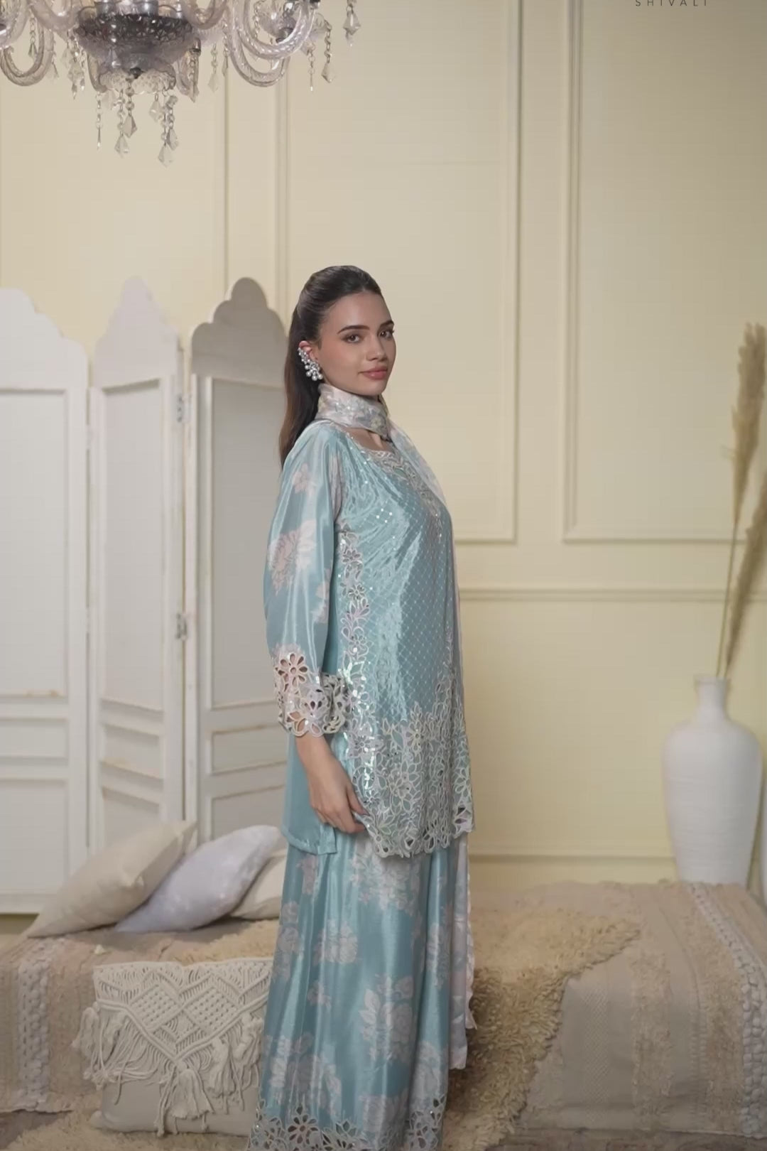 This sophisticated ice blue three-piece ensemble features a straight-cut kurta paired with wide-leg floral palazzo pants and a coordinating dupatta. Crafted from premium silk, the silhouette is defined by intricate cut work and rich scalloped cut-work embroidery at the hemlines and neckline. The outfit is further enhanced with shimmering sequin and bead highlights for a refined festive look.