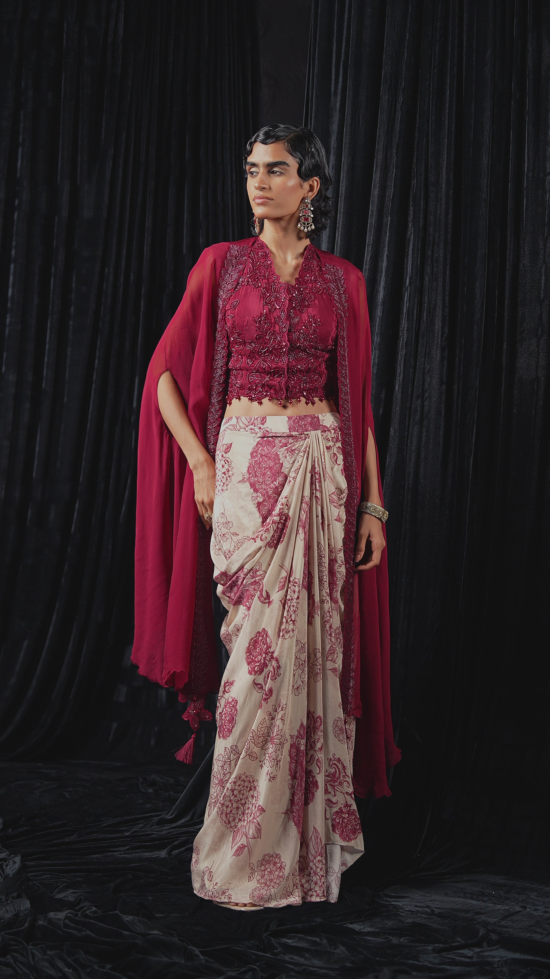 Command attention in this striking Maroon & Ivory Set. This three-piece ensemble features an intricately hand-embellished, front-opening satin silk top and a dramatically draped skirt with a complementing print. The look is completed with a flowing organza silk cape, creating an unforgettable silhouette.