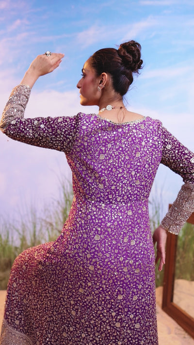 This stunning two-piece ensemble is ideal for formal occasions, weddings, or receptions, showcasing a beautiful color gradient and dense hand-embellishment. It features a full-sleeved Anarkali Kurta with an ombre effect, paired with a coordinating Wide-Legged Palazzo, both crafted from flowing Georgette Silk.