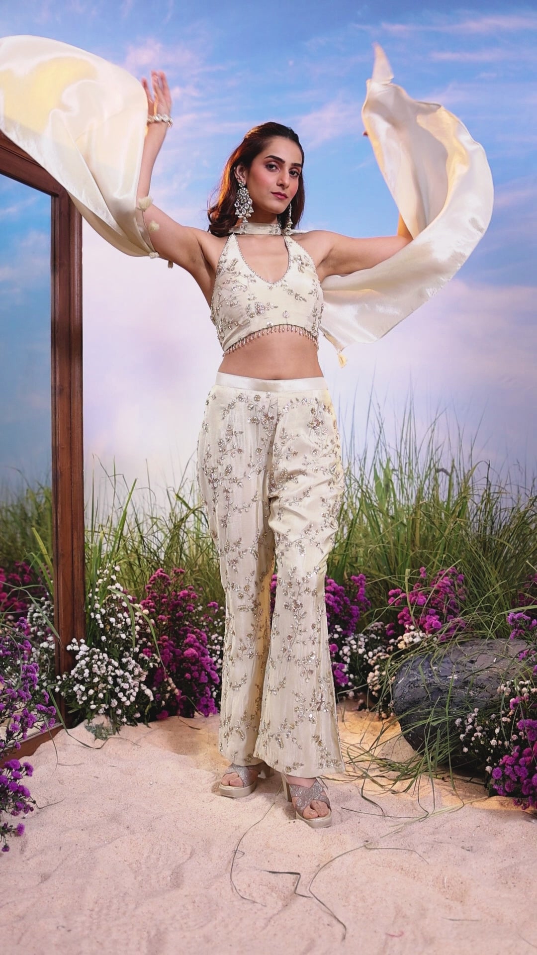 This elegant three-piece Indo-Western ensemble is perfect for cocktail parties, receptions, or destination weddings. It features a halter-neck Crop Top with a plunging V-neckline, voluminous Flared Trousers/Pants, and a delicate trailing Dupatta, all adorned with shimmering handwork.