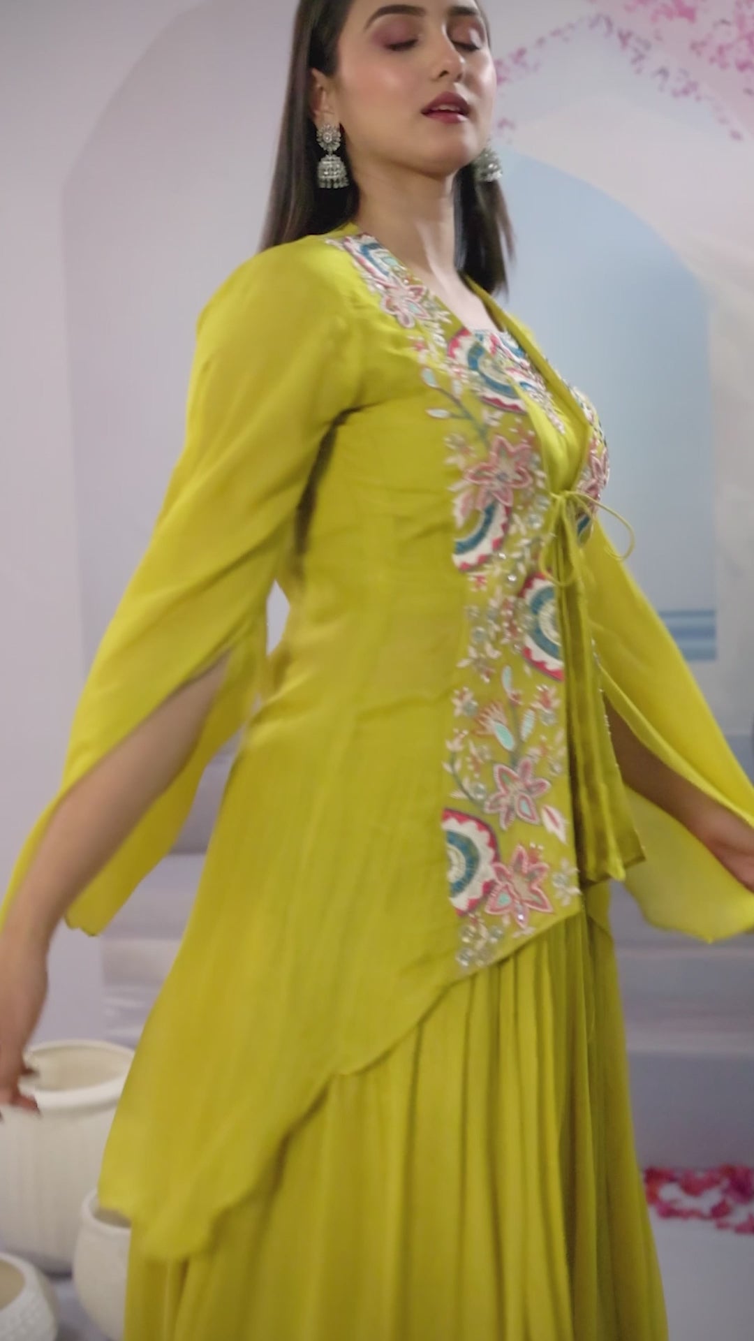 Resonates your look with style and refinement with our Yellow Embellished Organza Silk Cape Set. The meticulously hand-worked of sequins, beads and cutdana work on the tunic with cape showcase exquisite craftsmanship. Complemented by matching skirt and crop top. This ensemble radiates effortless grace. Perfect for year-round festivities.