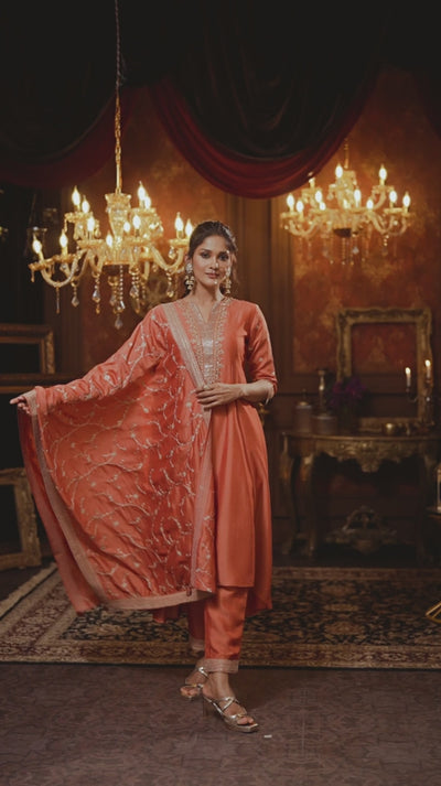 Glow with festive charm in this stunning Terracotta Rust Pant Set. This three-piece ensemble, crafted from luxurious premium silk, features a flowing kurta with a flattering V-neck and asymmetrical hem. The yoke is intricately hand-embroidered with metallic sequins and Zari, beautifully complemented by a fully embellished dupatta with rich vine motifs and heavy borders.