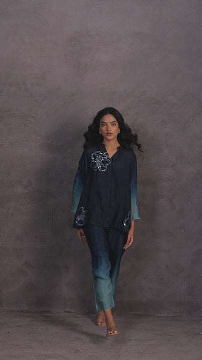 Midnight Teal Mist Embellished Raw Silk Co-Ord Set
