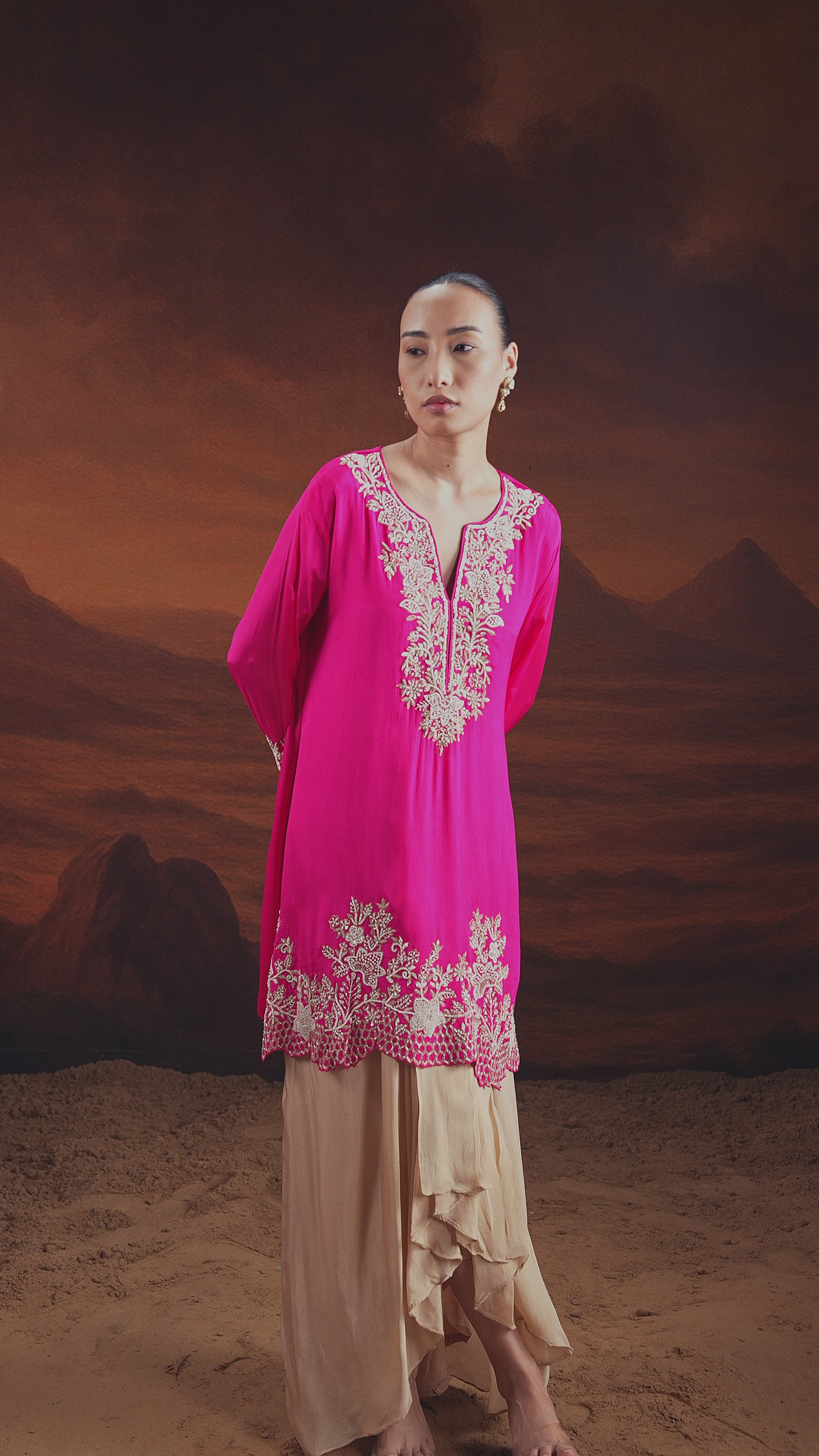 Make a statement in this striking Fuchsia Pink & Beige Set. Crafted from flowing chinon silk, the vibrant kurta features an elegantly scalloped hem and is beautifully adorned with intricate cut dana, sequin, bead, zari, and thread handwork. It is perfectly complemented by a soft, draped skirt, creating a sophisticated and eye-catching ensemble.