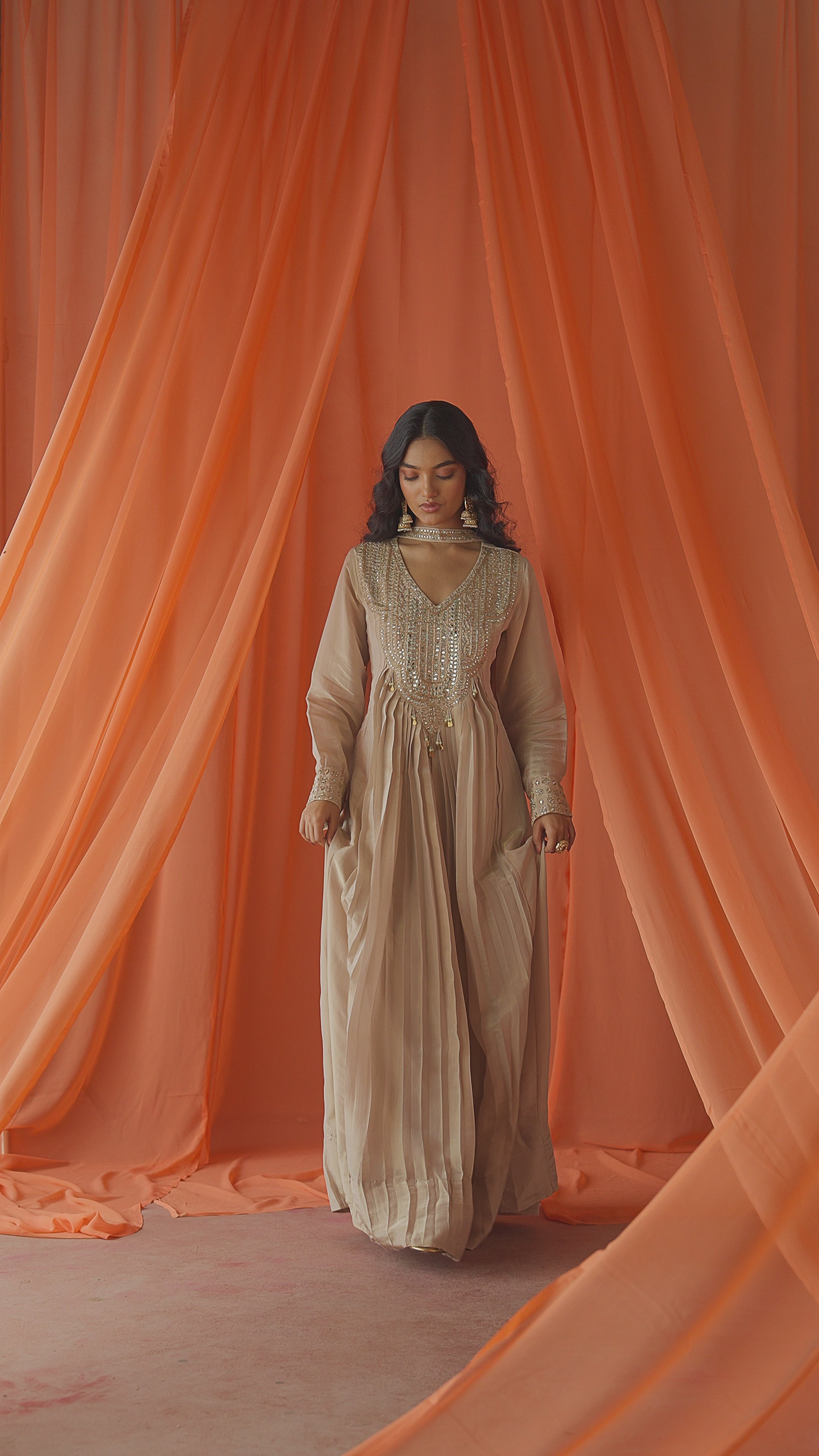 Camel Beige Embellished Shimmer Organza Silk Anarkali Set
