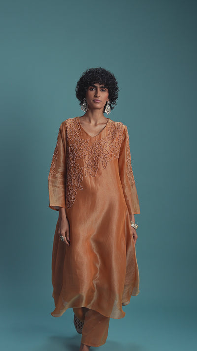 Radiate warmth and elegance in this beautiful Rust Gold Ensemble. This two-piece set features a shimmering tissue silk kurta with intricate sequin, stone, and bead handwork in a delicate floral pattern. It's perfectly paired with matching pants for an effortlessly chic look.
