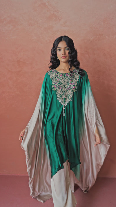 Elevate your festive wardrobe with our Dark Green Embellished Satin Silk Kaftan Set — a perfect blend of elegance and comfort. Crafted in luxurious satin silk, this kaftan features an ombré transition from rich emerald green to a soft beige hue, exuding effortless grace The neckline is adorned with intricate hand embroidery, highlighted by zari work, sequins, and delicate bead embellishments that add a regal charm. The flowy silhouette ensures a flattering drape, while the lightweight fabric offers ease of movement — ideal for festive celebrations.