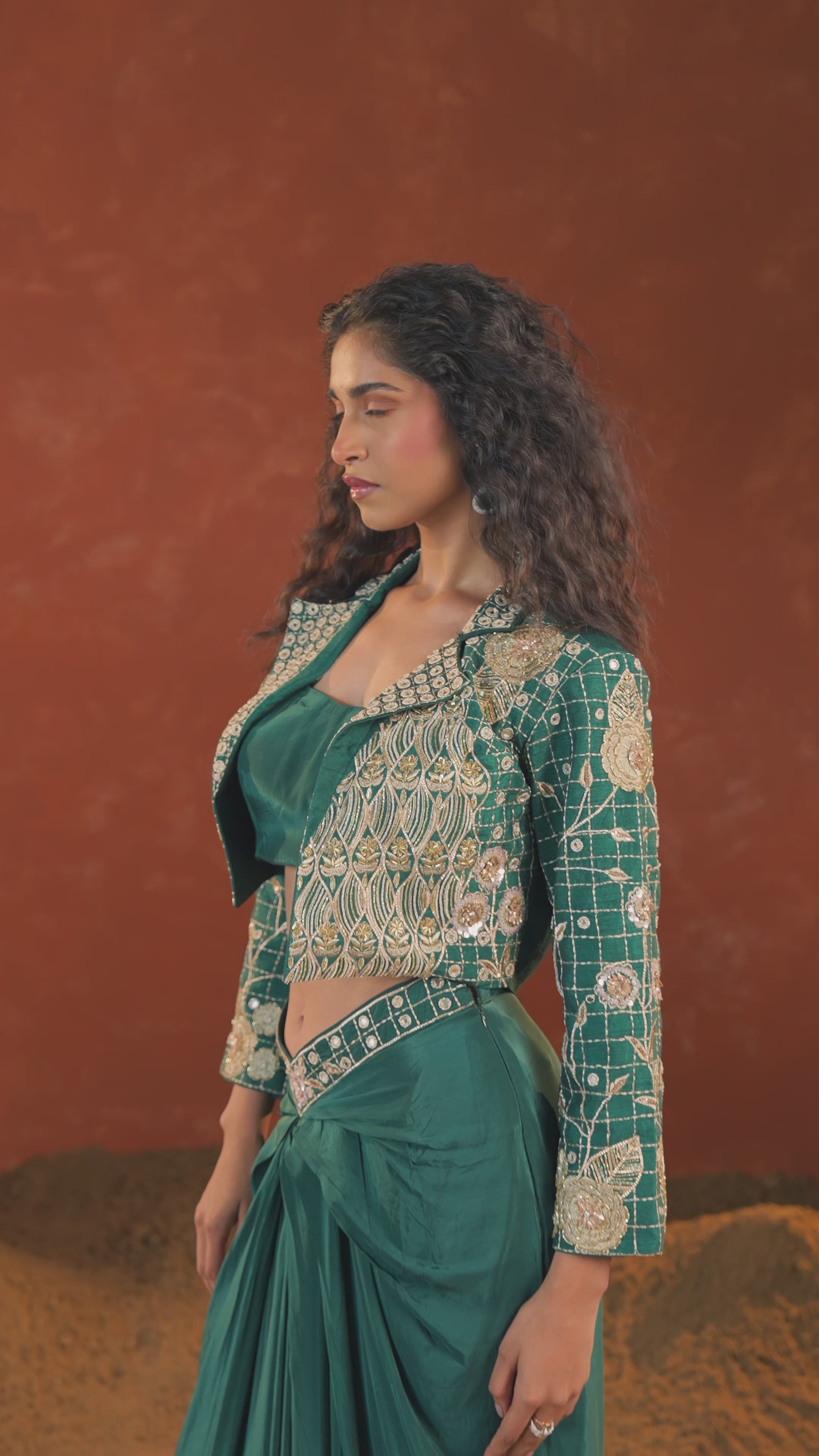 This stylish outfit features a satin silk drape skirt, creating an elegant and fluid silhouette, complemented by a solid crop inner top. The raw silk jacket stands out with its exquisite detailing, showcasing intricate bead, cut dhana, golden thread, mirror, and sequin work. This fusion of traditional craftsmanship and modern design makes for a sophisticated and striking look.