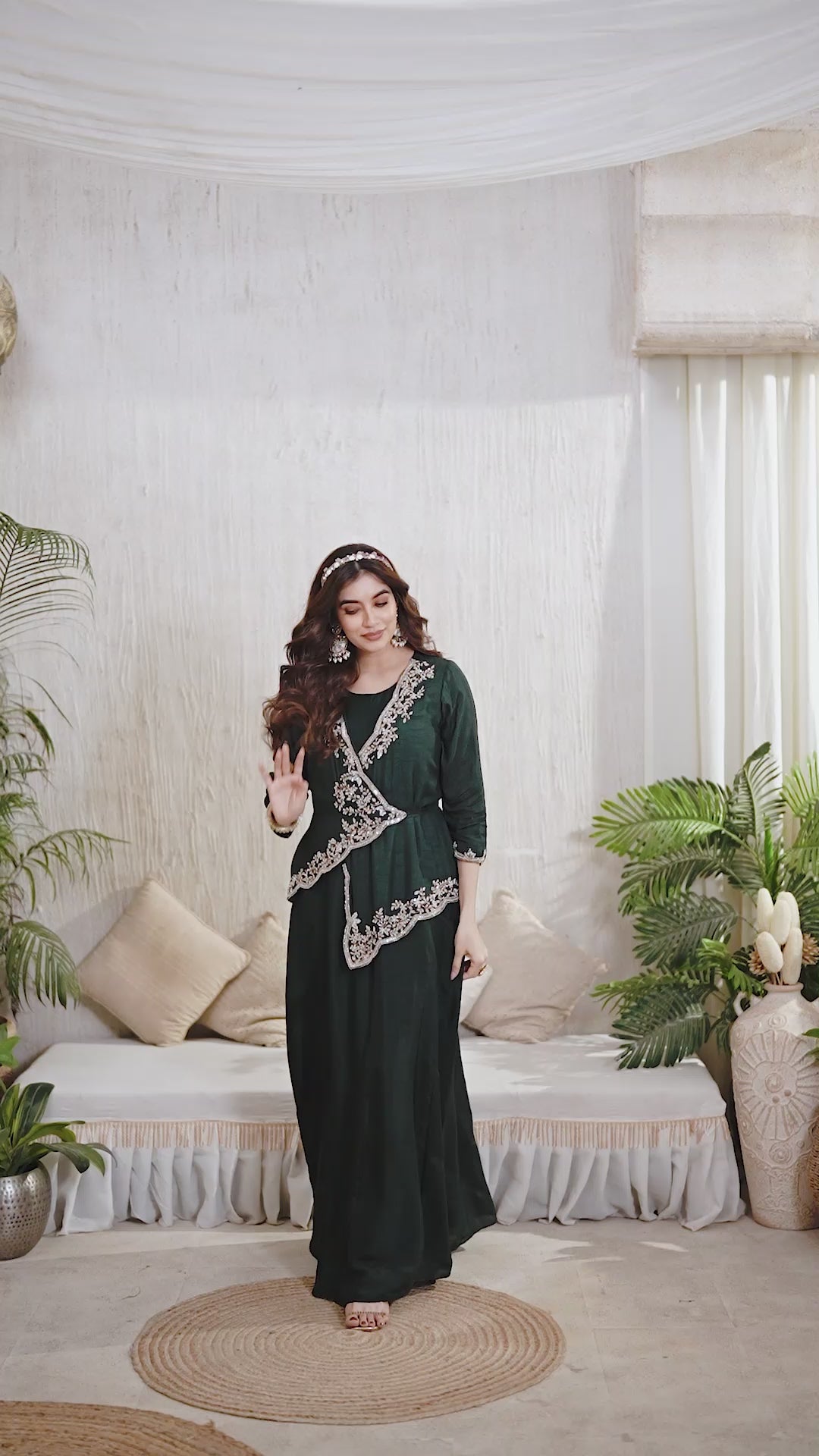 A vibrant Dark Green Raw Silk gown featuring an intricate embroidered jacket-style overlay with a flattering peplum silhouette and adjustable drawstrings at the back for a customized fit.
