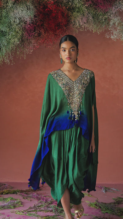An elegant ombre kaftan set crafted in rich raw silk fabric. The kaftan features flared sleeves with a relaxed silhouette and intricate hand embroidery on the neckline using cut dana, Zari, bead, and thread work, enhanced with playful tassel detailing. Paired with a pleated draped skirt that adds volume and fluidity to the ensemble. The rich forest green base fades into a royal blue hem, adding depth and sophistication to the overall look.