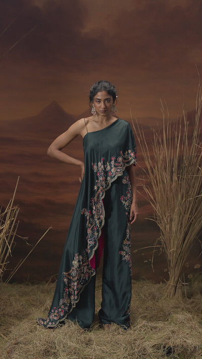 Step into modern elegance with this raw silk one-shoulder tunic and palazzo set, featuring a striking asymmetrical drape that cascades gracefully on one side. The look is elevated with beads, sequins, stones, and intricate hand-embellished work, complete with a scalloped embroidered border. Paired with heavily embellished palazzo pants, this ensemble blends structure with fluidity for a contemporary festive statement.