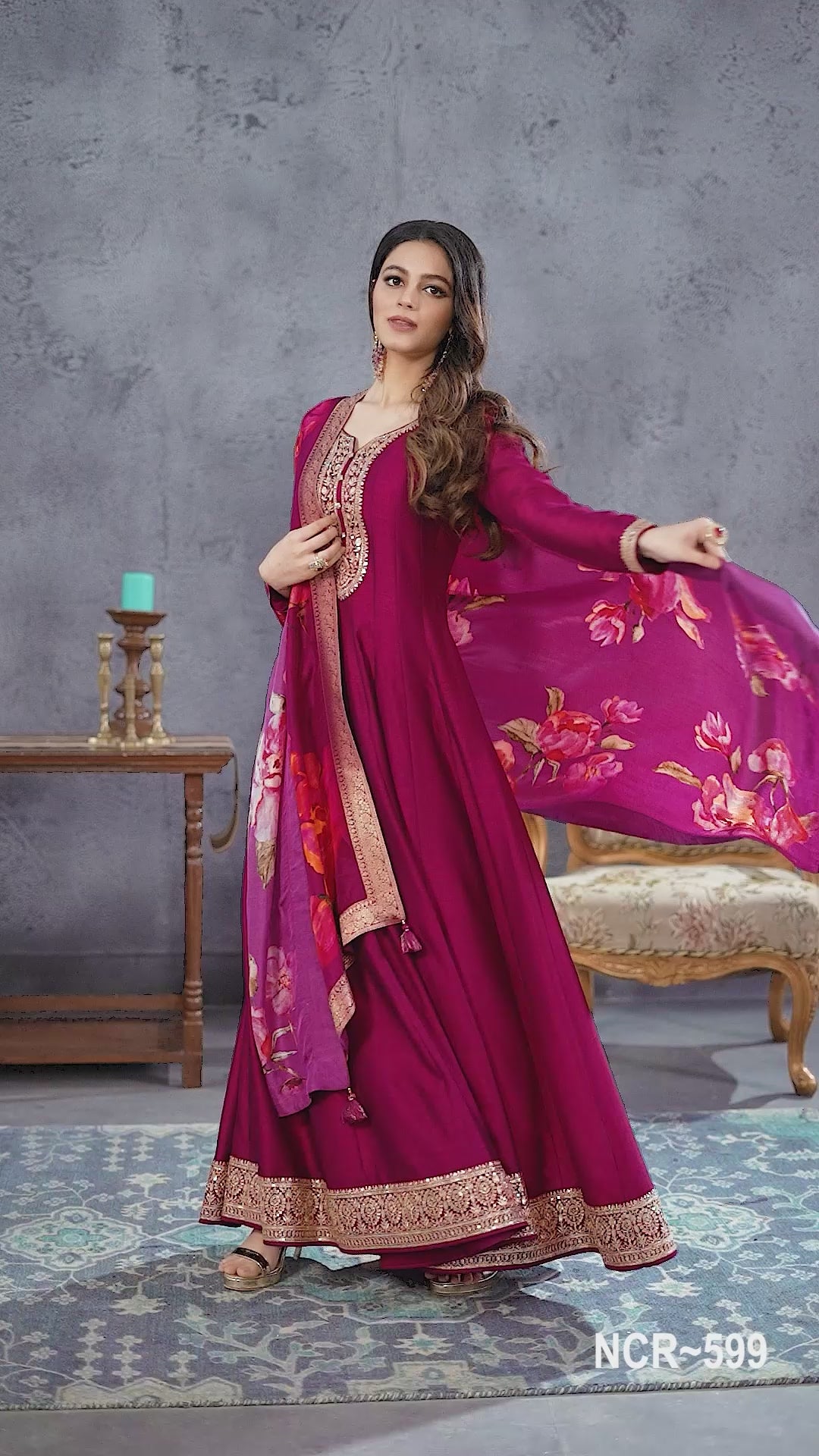 Drape yourself in regal elegance with this stunning Brocade Silk Anarkali set, adorned with exquisite Zardozi, thread work, and delicate sequin detailing on the neckline and borders. The ensemble is beautifully complemented by a floral embellished organza dupatta, featuring intricate embroidered borders that add a graceful finishing touch. Perfect for festive celebrations, weddings, and special occasions.