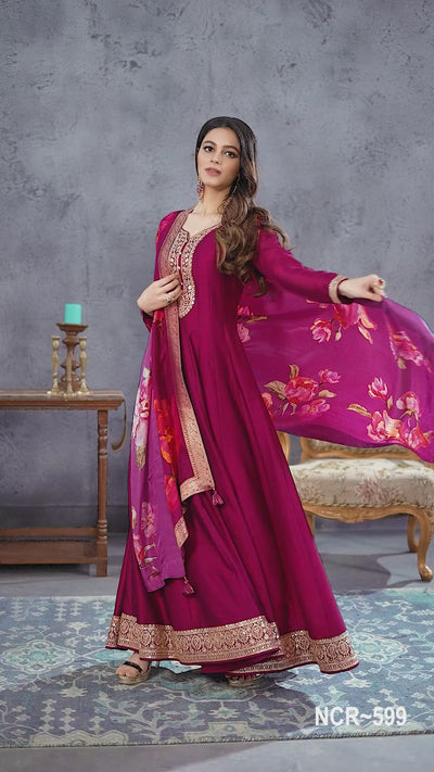Fuchsia Pink Embellished Brocade Silk Anarkali Set