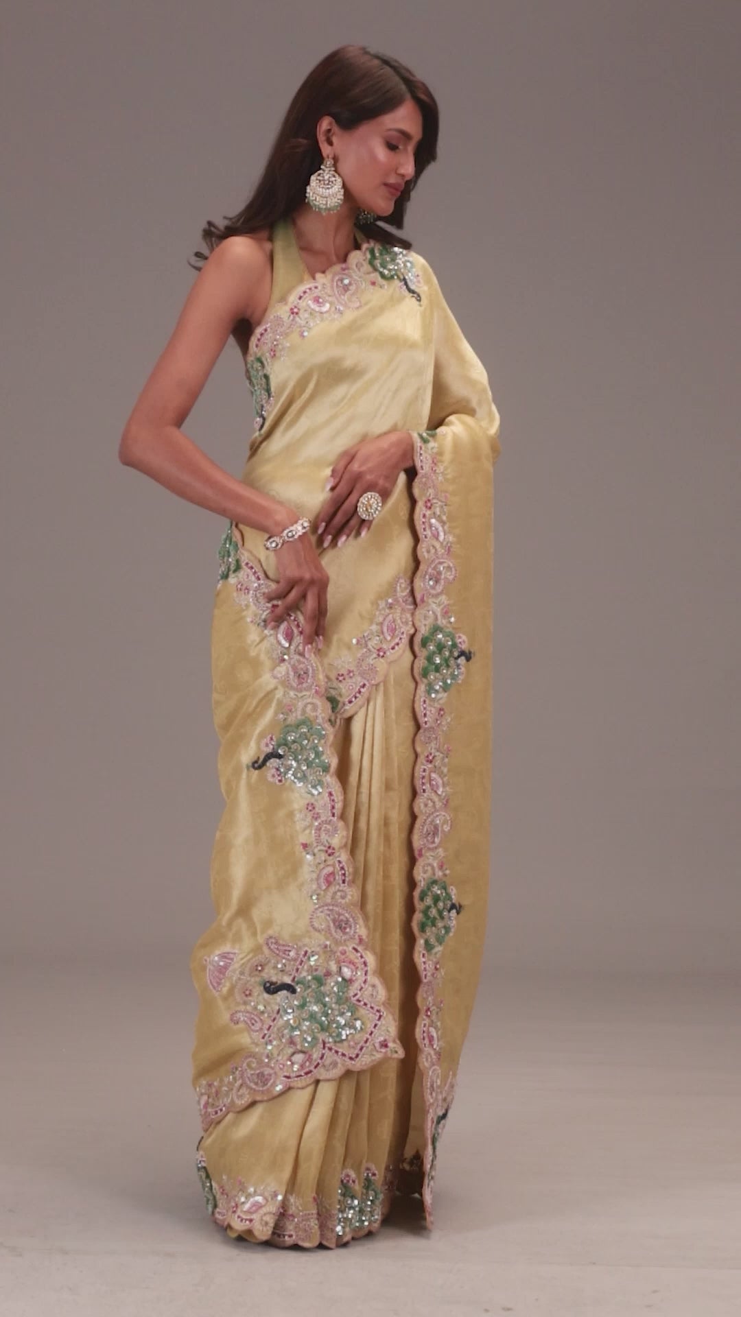 This magnificent saree showcases a luxurious Tissue material embellished with golden thread handwork. Its subtle luster captures and reflects light, making it a remarkable option for any significant occasion. The accompanying blouse adds a delicate touch, rendering it perfect for elegant weddings, formal evening gatherings, and classy receptions. The sheer fabric drapes gracefully, accentuating your natural silhouette and exuding timeless sophistication.