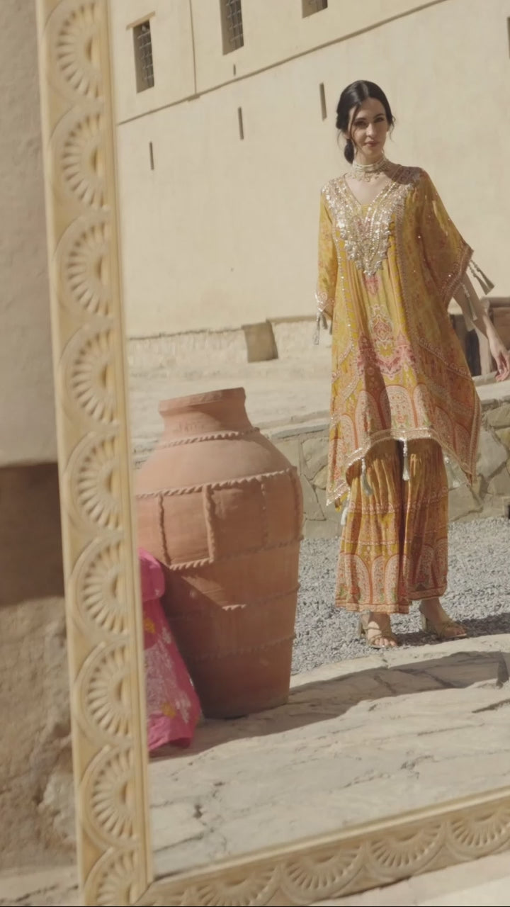 Experience timeless grace with the Golden Radiance Printed Kaftan Set. Combining heritage charm with modern design, this ensemble features an intricately printed kaftan adorned with exquisite mirrorwork and embroidery detailing. The flared sharara pants add a regal touch, allowing for effortless movement and comfort. Delicate tassels and embellishments enhance the Indo-Western fusion, making it ideal for festive soirées, destination weddings, and elegant celebrations.