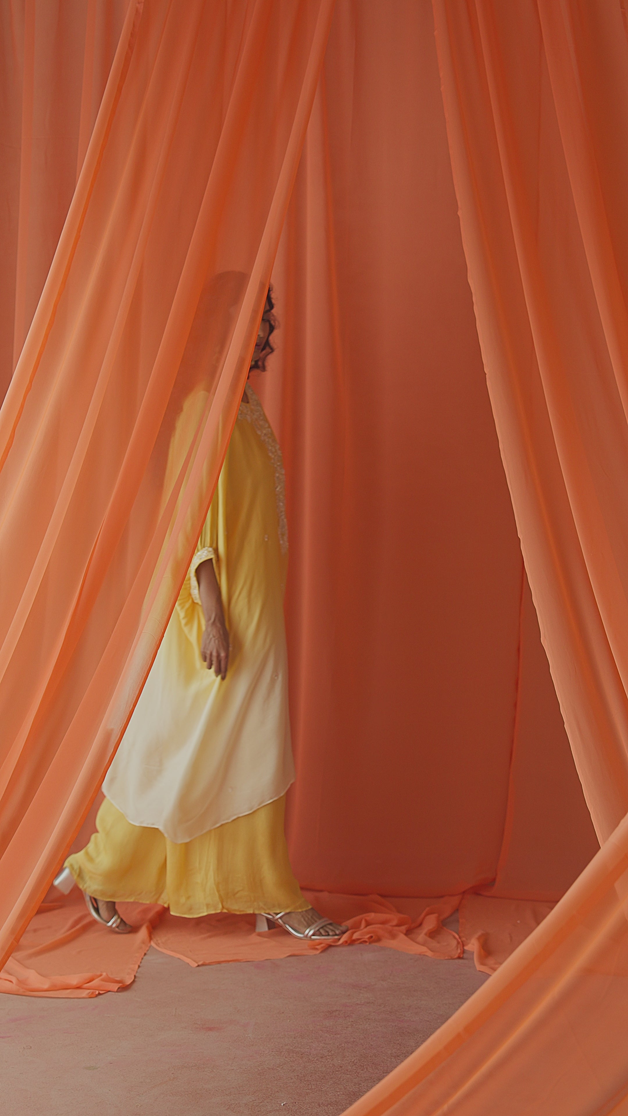 This Chinon silk ombre kaftan set features a stunning gradient from soft yellow to a deeper gold, adding a warm, elegant vibe. The organza dupatta is beautifully detailed with sequins, beads, cut dana, and golden thread work, complementing the set’s delicate charm. Paired with a solid inner, this ensemble is perfect for festive occasions, offering both comfort and sophisticated style.
