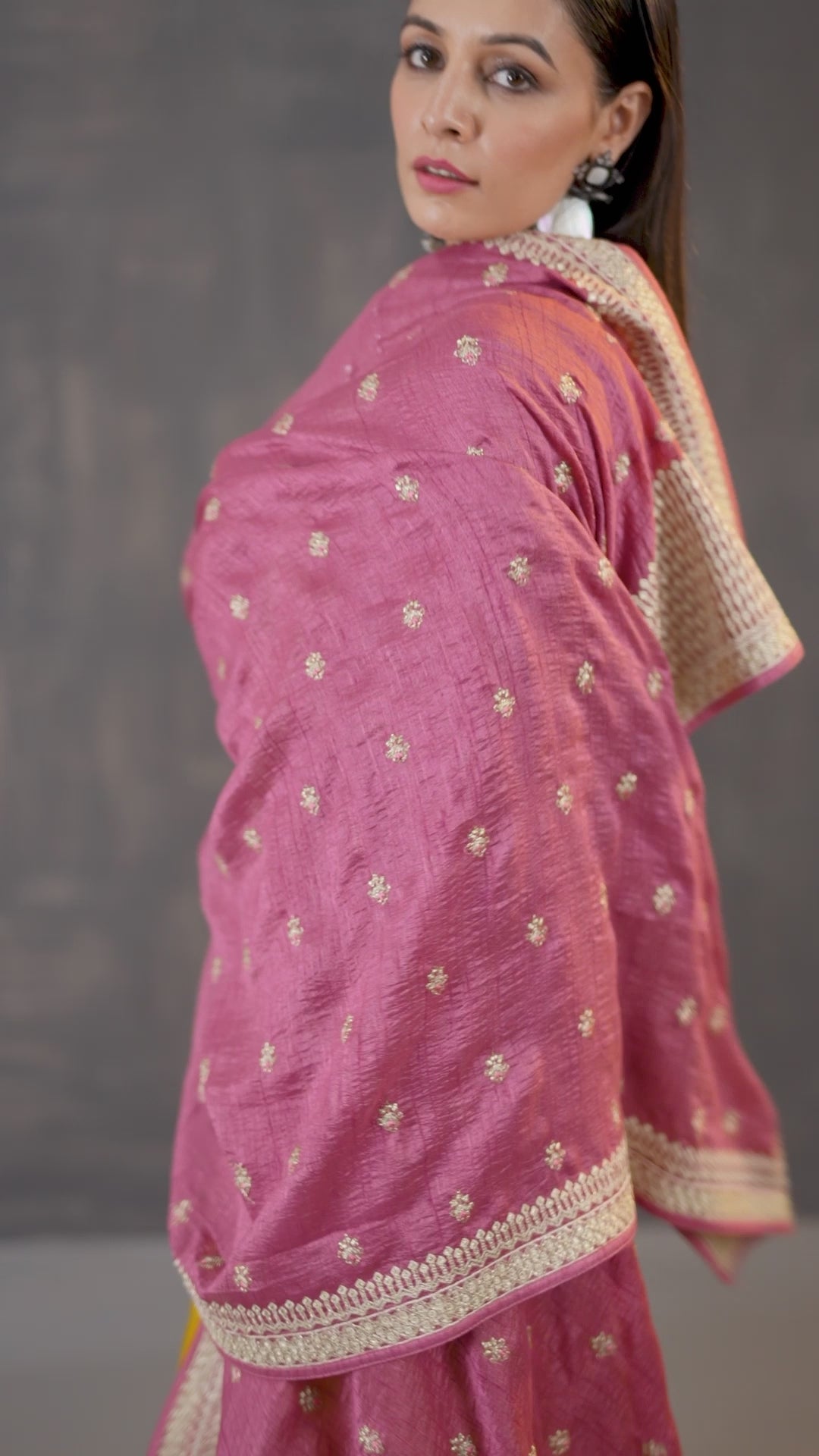 Golden yellow embellished premium silk anarkali. Styled with a front slit and fabric buttons. Crafted with sequin, aari taari and thread handwork embroidery. Paired with matching solid pants and blush pink embroidered dupatta. Apt for semi formal wear.