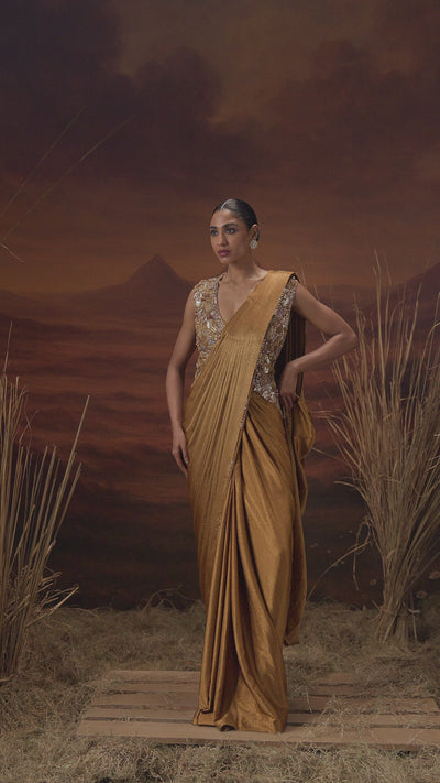 This exquisite outfit features a draped saree crafted from a tissue silk fabric in a rich antique gold hue. The ensemble includes a matching padded blouse that is intricately embellished with cut dhana, beads, and sequins. The blouse is designed with a V-neckline and can be styled with detachable sleeves, giving the wearer flexibility and a contemporary touch.