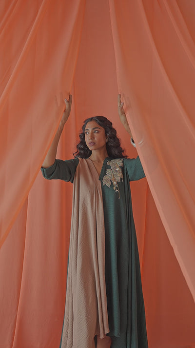 Step into effortless elegance with this flowing dress, where fluid draping meets artful detail in a play of soft contrast and refined embellishment.