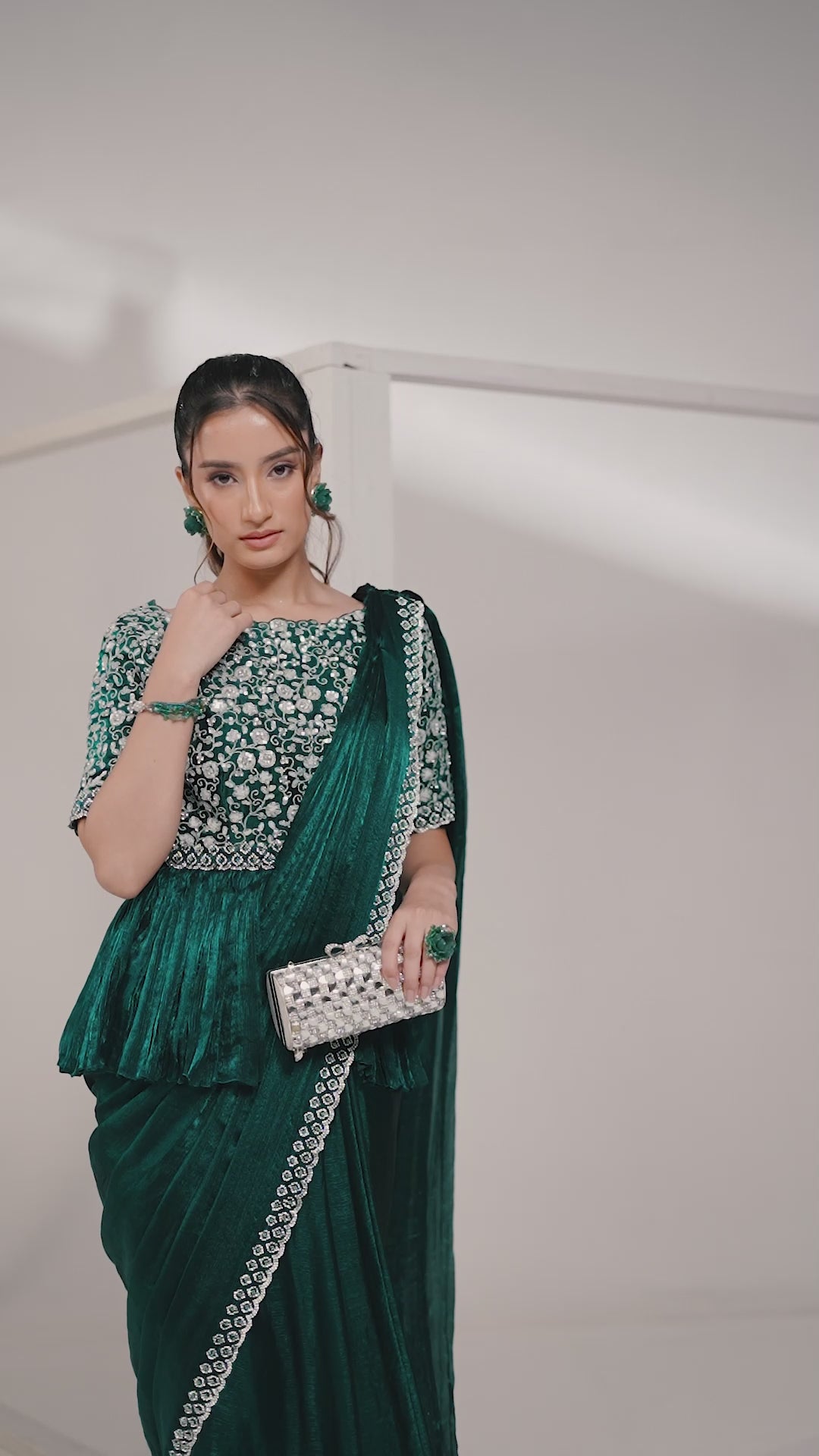 This Emerald Handwork Shimmer Chinon Silk Saree features sequins, stones, beads and aari tari work on border. The embellished stitched blouse is made from malai satin fabric, designed to fit up to 38 inches, with a margin of 42 inches for size adjustments. It is paired with a waist belt, making it the perfect ready-to-wear saree for cocktail parties and other functions.