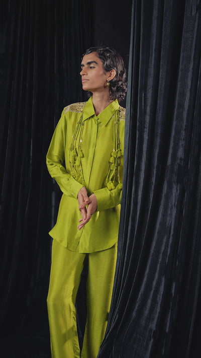 Lime Green Embellished Raw Silk Co-Ord Set