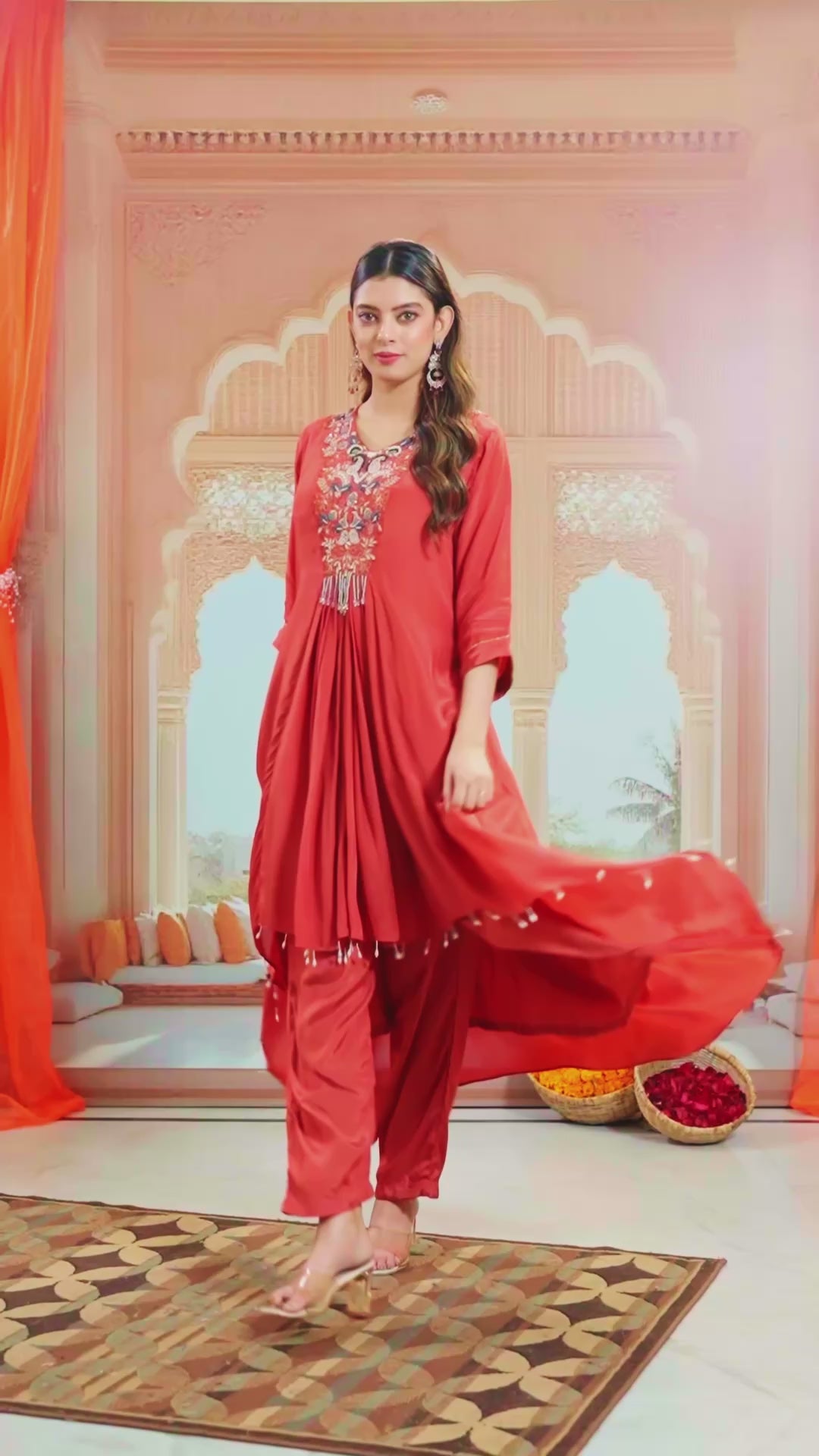 Endure a statement of grace and style with our Red Handwork Crepe Silk Kurta & Pant Set. The meticulously hand-worked of sequins, beads, cutdana and resham thread work on the asymmetrical kurta. Paired with matching solid pants to complete the look. Perfect for year round festivities.