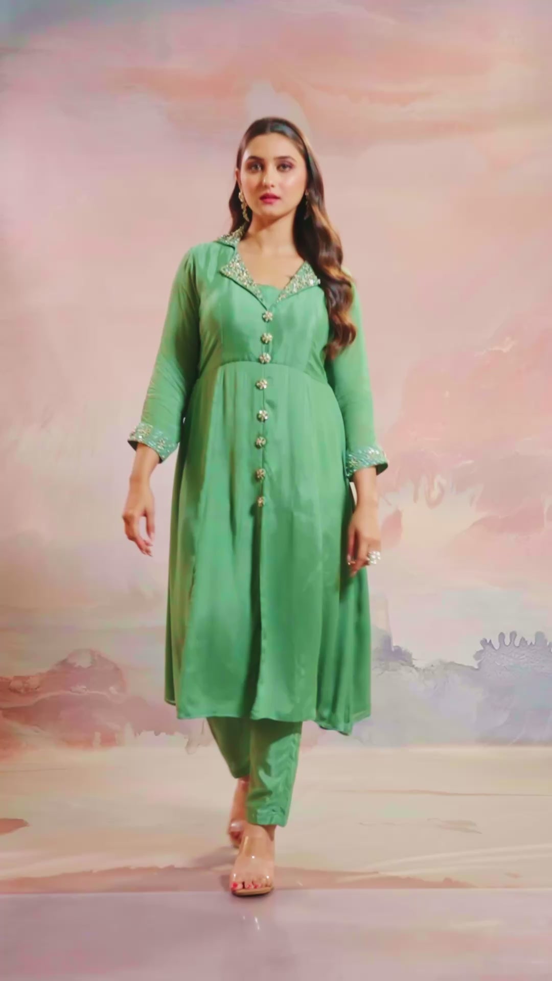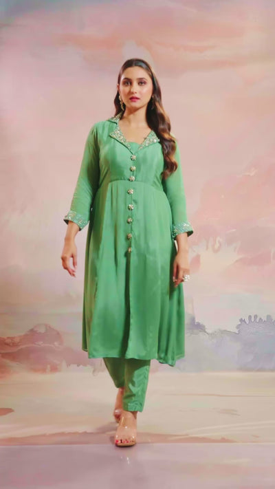 Endure a statement of grace and style with our Green Handwork Crepe Silk Kurta & Pant Set. The meticulously hand-worked of sequins and beads work on the kurta. Paired with matching solid pants to complete the look. Perfect for year round festivities.