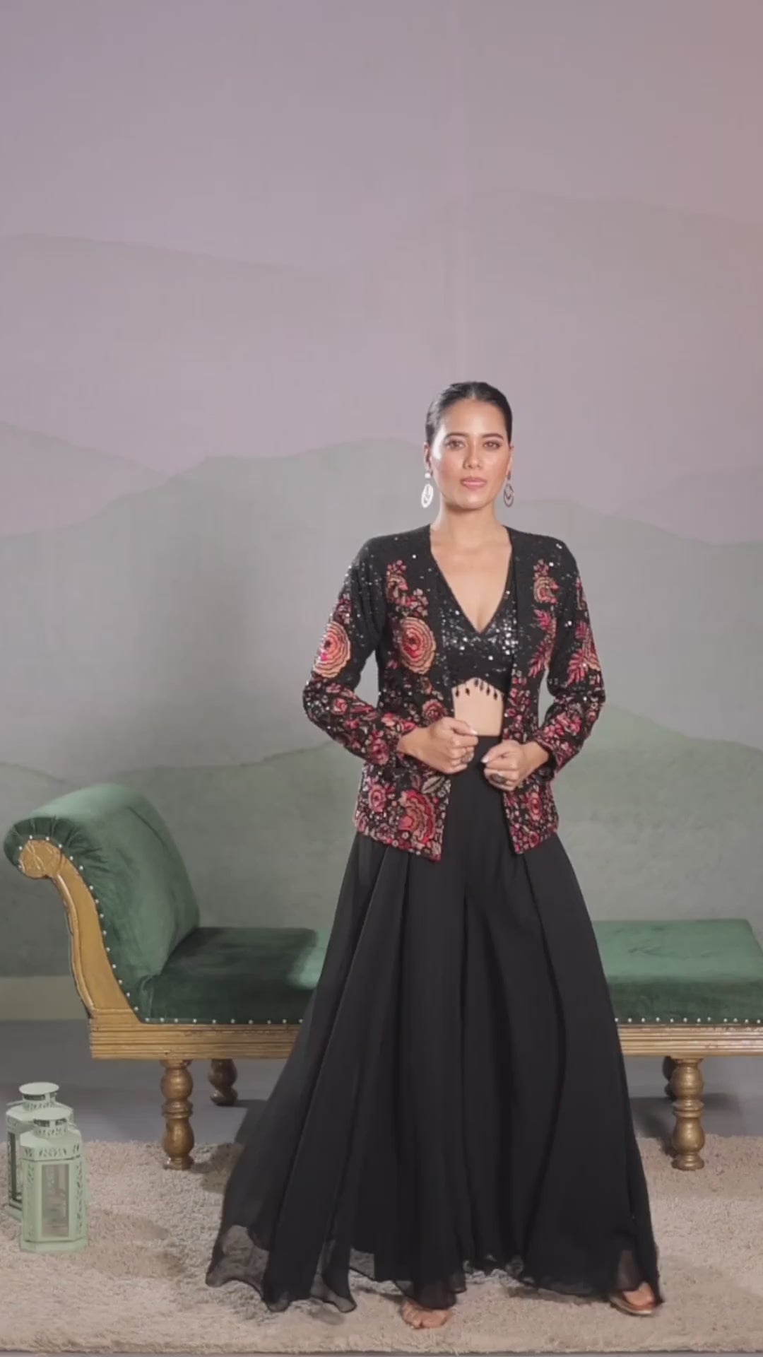 Introducing our Black Embellished Georgette Silk Jacket Co-Ord Set. This striking ensemble features full embellishment with sequins, beads, aari tari, thread and stone handwork on the jacket and top. Paired with matching flared palazzo, this set exudes sophistication and style, making it perfect for chic evening events.