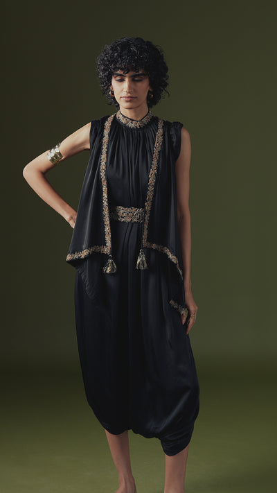 This elegant ensemble features a shrug-style tunic crafted in luxurious satin silk, paired with a solid inner and a coordinated embellished belt. The rich black fabric is enhanced with intricate zari, bead, stone, and golden thread work that adds a regal charm. The relaxed drape of the shrug, combined with statement tassels and delicate detailing, brings a perfect blend of traditional artistry and contemporary silhouette.