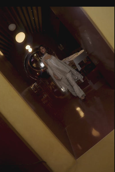 Make a statement in refined elegance with this exquisite White Embellished Palazzo Set, crafted in luxurious organza silk. The ensemble features a stunning peplum-style long top, intricately adorned with aari tari, sequins, thread, bead, stone, and mirror embellishments—showcasing the richness of traditional craftsmanship with a modern silhouette.