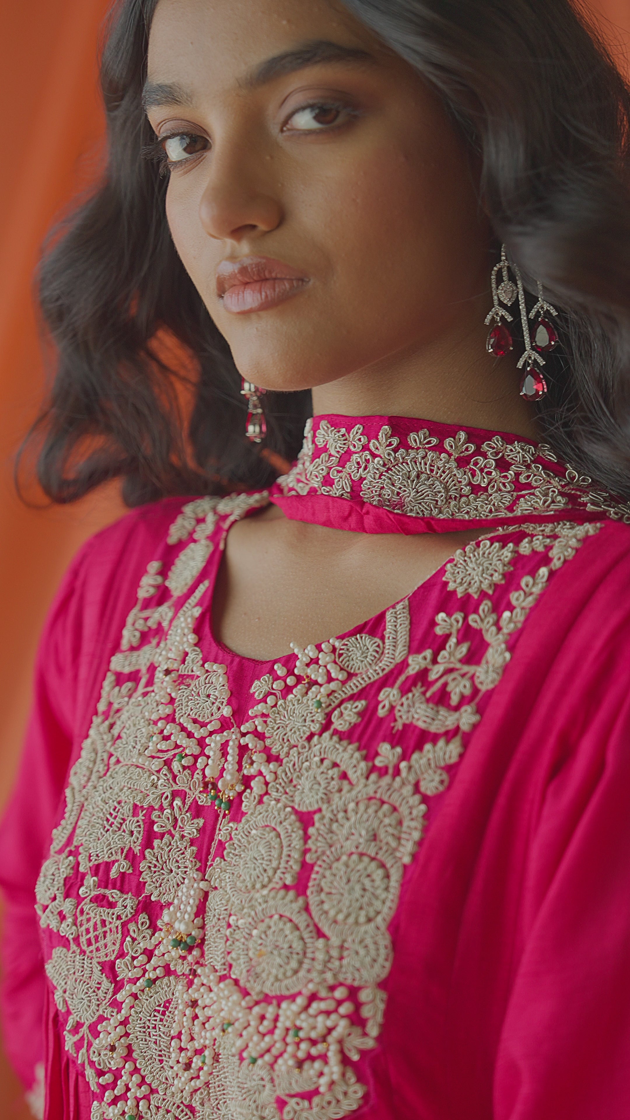 Make a bold statement with this hot pink full-length gown crafted in luxurious raw silk. The set includes an embellished choker-style dupatta, adding a unique fusion twist. Intricate handwork with zari, beads, and sequins enhances the richness of the outfit. Perfect for weddings, receptions, or grand festive occasions.