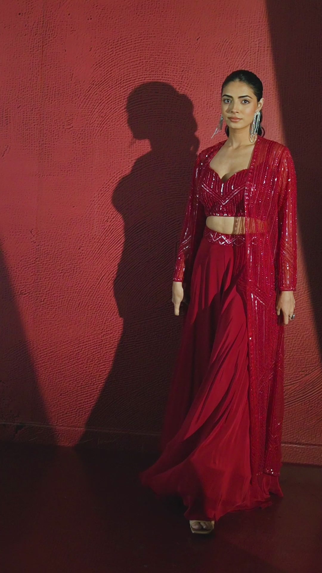 Introducing our Hot Red embellished premium net shrug. Expertly crafted with intricate sequin, bead, cut dana handwork. Paired with a matching padded crop top and solid crepe silk flared palazzo. Apt for semi formal wear.