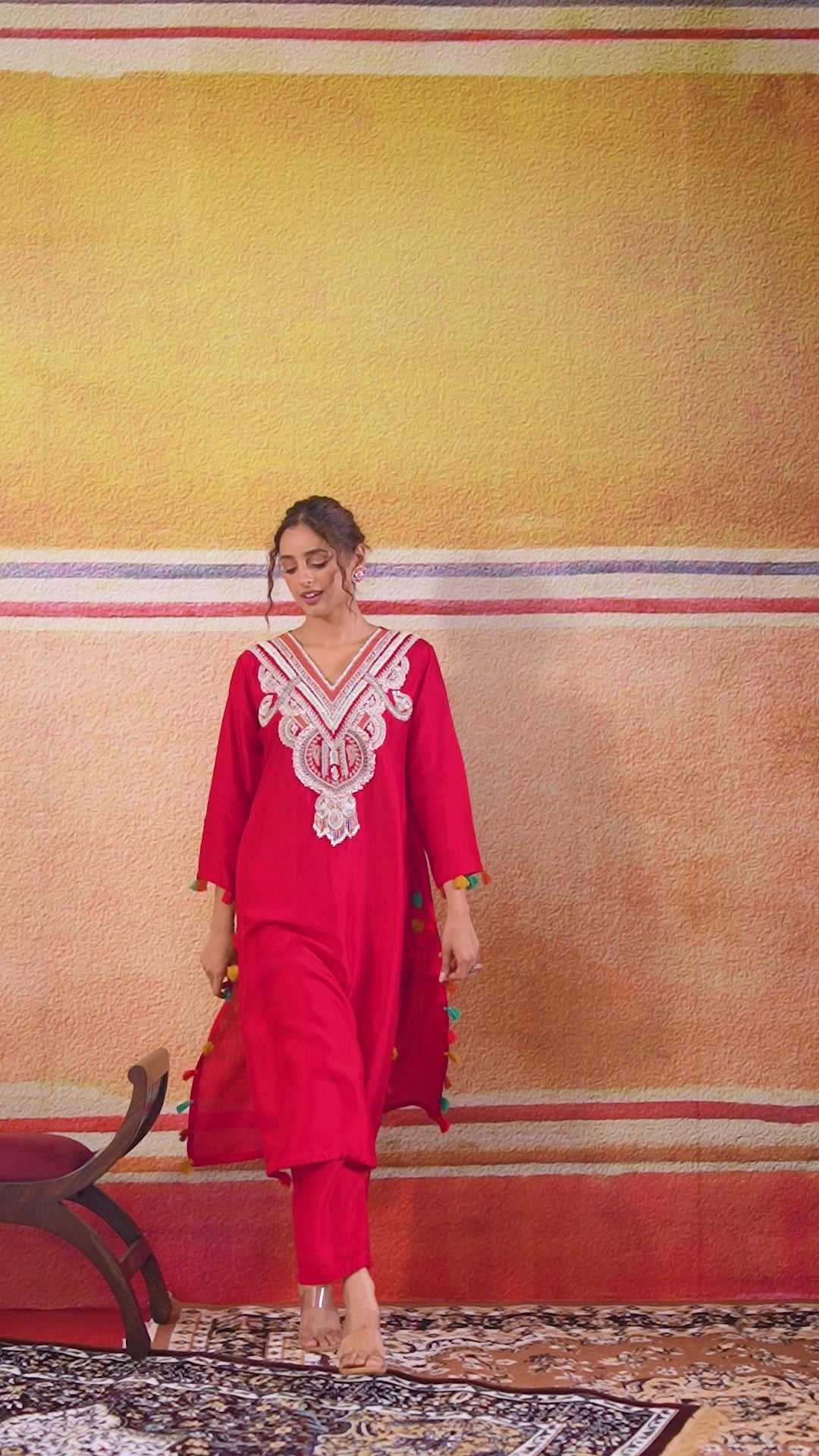 Add this statement ensemble to your festive look, the hot red raw silk kurta crafted with pearls, sequin, beads, zari and thread tassels. It comes with raw silk solid palazzo pants. This chic style kurta set will surely turn heads towards you.