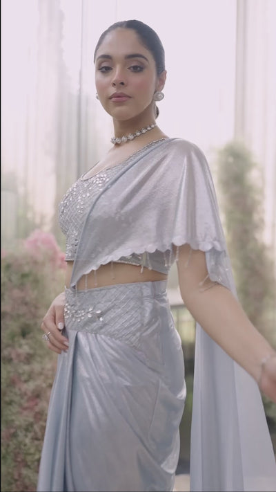 This dazzling two-piece ensemble features a modern draped skirt with fall and a padded blouse, crafted in shimmering Lycra Silk for a fluid, figure-flattering silhouette. The icy hue and intricate handwork make it a stunning choice for parties and evening events.