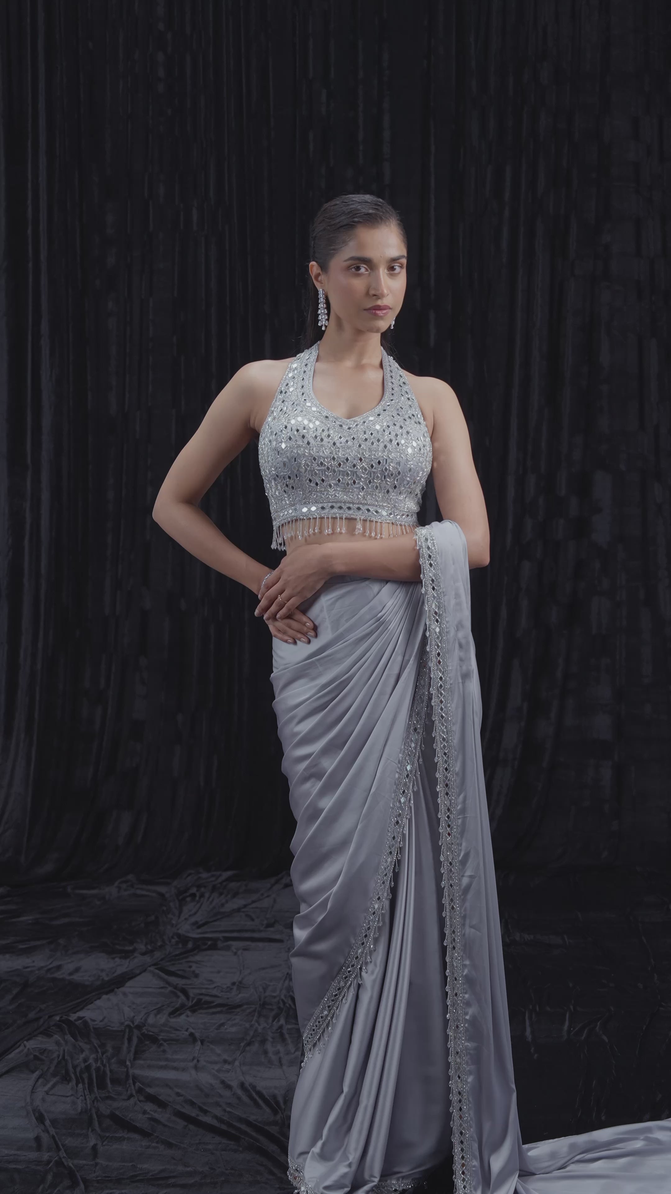 Make an unforgettable statement with this glamorous draped saree set — where modern edge meets timeless shimmer. Perfect for evening soirées and grand celebrations.