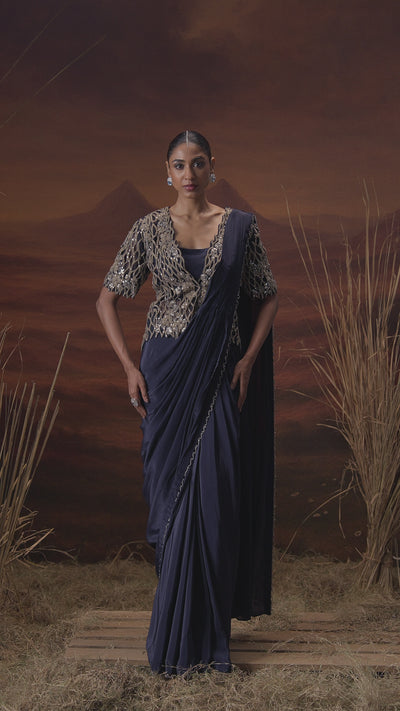 This outfit pairs an elegant imperial blue satin silk drape saree with a solid crop inner. A stunning jacket, adorned with intricate bead and sequin work, as well as shimmering cut dhana and decorative hangings, is worn over the top. This sophisticated ensemble seamlessly blends traditional draping with a modern, structured silhouette.
