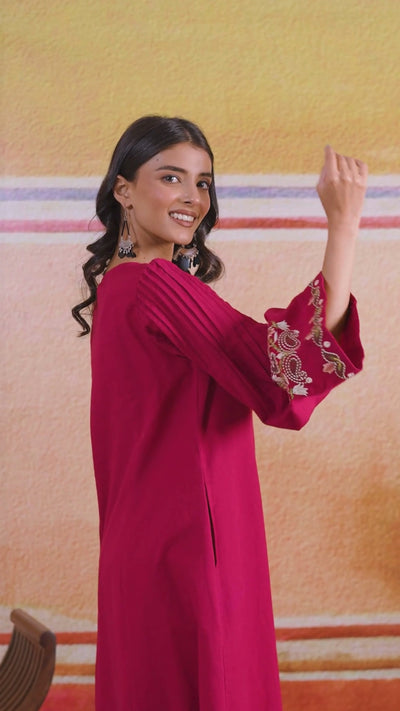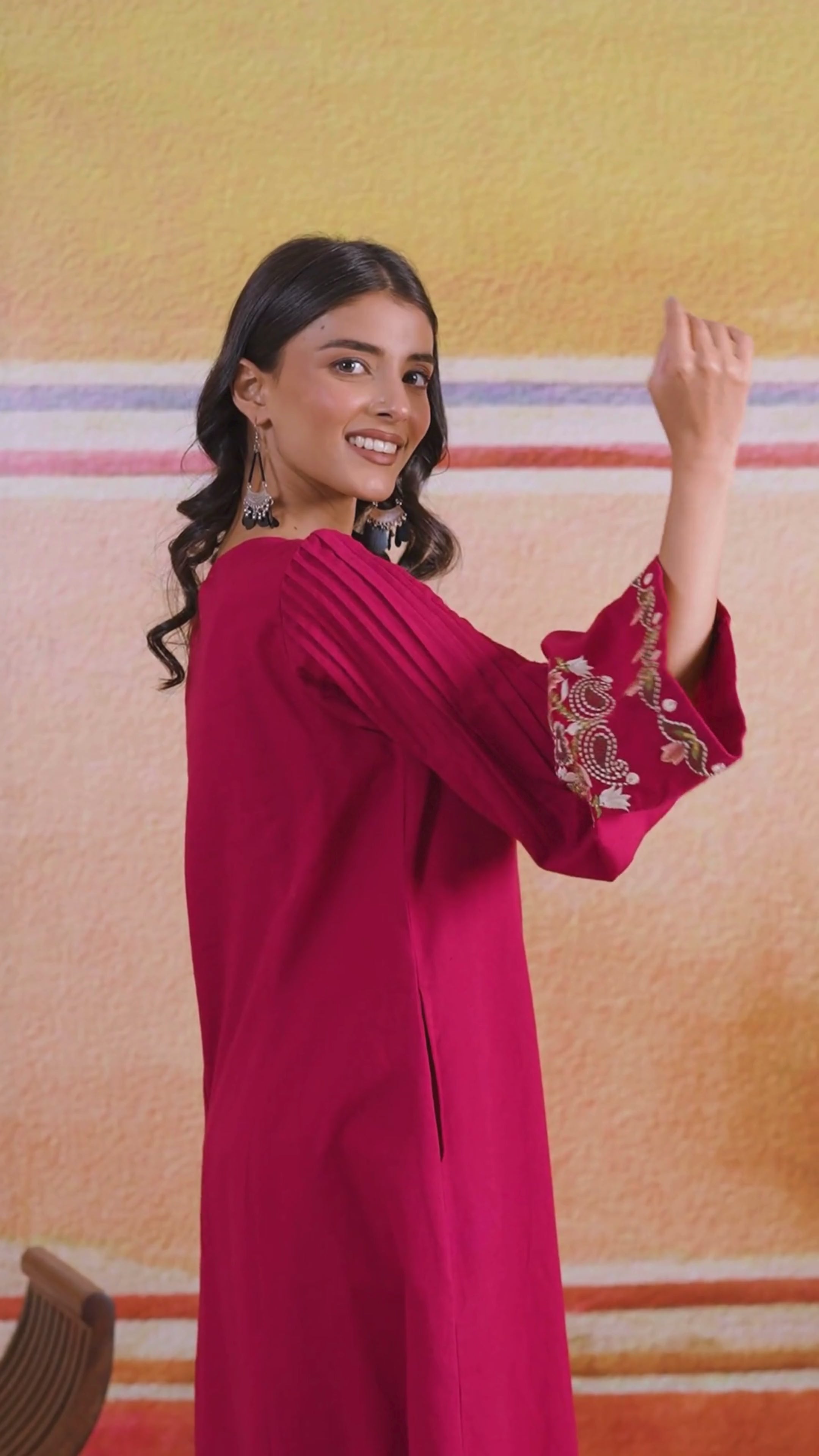 Immerse yourself in timeless elegance with this red traditional dress, adorned with intricate floral embroidery in soft beige and gold tones. The below-knee silhouette features wide sleeves and a relaxed fit, offering both comfort and grace. Crafted in the same premium fabric as our co-ord sets, this piece is ideal for cultural gatherings, festive occasions, or elegant daywear. Paired with neutral-toned heels, it creates a striking yet sophisticated ensemble.