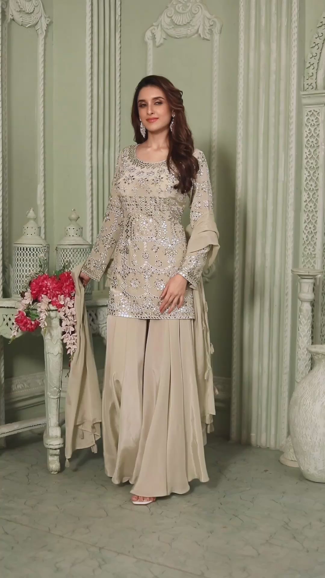 Celebrate in style with this Ivory Beige Embellished Kurta & Palazzo Set crafted from soft crepe silk. The kurta shines with fun thread work, sparkling mirrors and stones, making it perfect for sangeet, festive gatherings and religious functions. Paired with flared palazzo pants and a matching dupatta, this outfit lets you twirl, dance and dazzle all day long