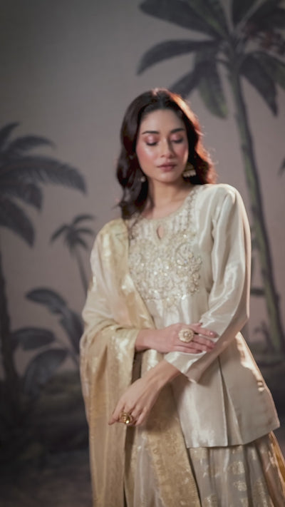 Beige Gold Embellished Shimmer Tissue Silk Lehenga Set