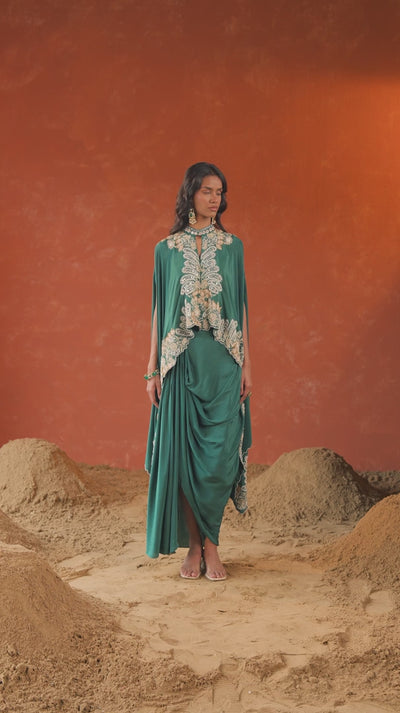 This elegant ensemble features a premium silk draped skirt with a cape-style top layered over a solid inner crop top. Intricate sequin, bead, cut dana, mirror, and stone work adds a luxurious touch to the rich Jade Green hue, making it perfect for festive and wedding occasions.