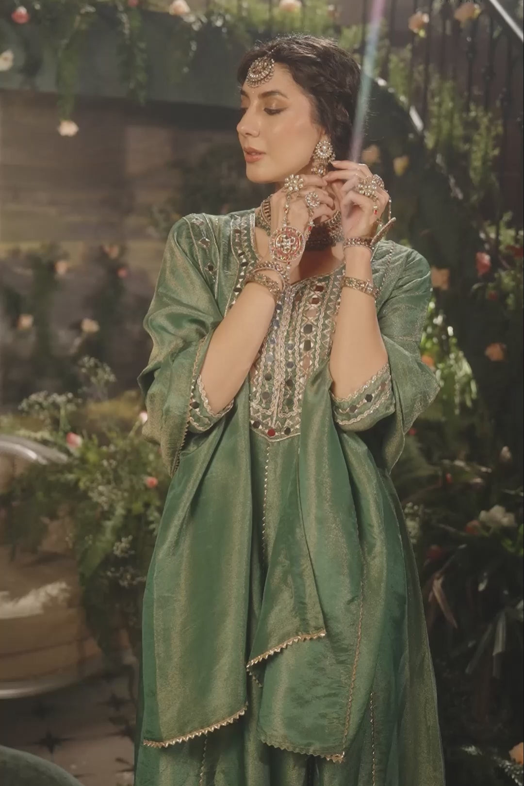 This vibrant jade green ensemble features a regal Anarkali-style silhouette with a flared kurta, slim-fit pants, and a coordinating dupatta. Crafted from luxurious shimmer tissue silk, the outfit is exquisitely detailed with heavy mirror-work and gotapatti embroidery on the neckline and hem. Intricate geometric patterns and mirror-lined borders along the dupatta add a radiant, traditional charm to this sophisticated festive look.