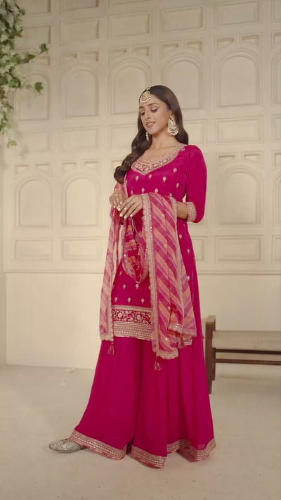 - Crimson Pink Leheriya Kurta featuring detailed embroidery and subtle sequin embellishments.